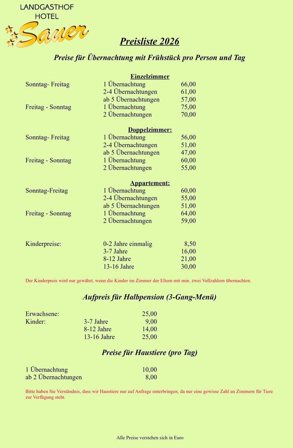 Die ortsübliche Kurtaxe in Höhe von 1,50 Euro pro Person und Tag wird zusätzlich für Personen ab 15 Jahre berechnet.